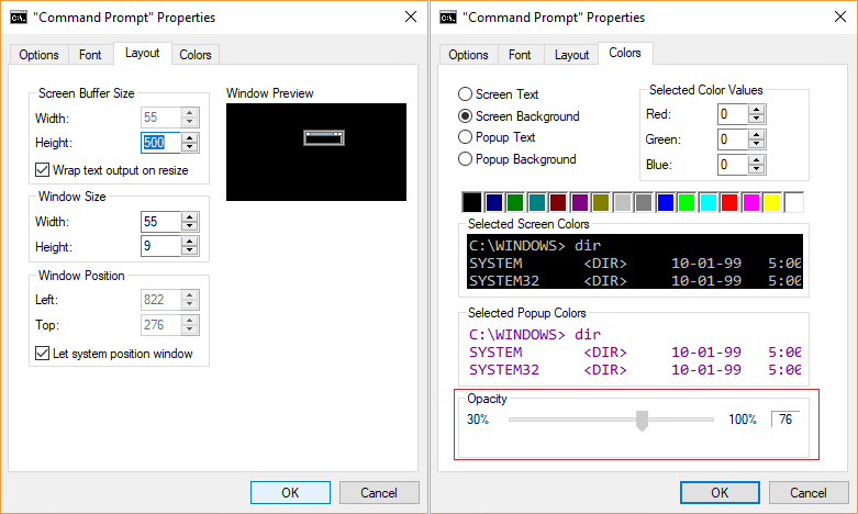 同様に、ウィンドウの透明度を調整することもできます コマンド・プロンプト(コマンド・プロンプト) 不透明度を調整します。 これらの設定はすべて、サードパーティ ツールを使用せずに、コマンド プロンプトのプロパティ ウィンドウ内で調整できます。 だから、時間を無駄にせずに見てみましょう 何(どうやって) 変化する コマンド プロンプト画面バッファのサイズ(コマンドプロンプト画面のバッファサイズを変更) そしてその 透明度レベル(透明度) 以下のガイドの助けを借りて。