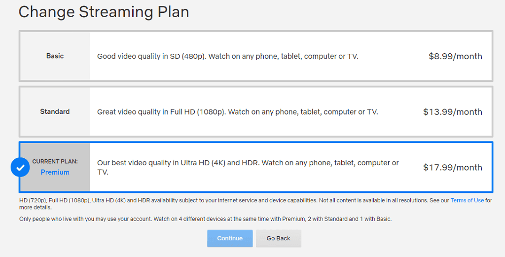 計画 必要不可欠(ベーシック) 月額 8.99 ドルですが、ストリーミングの品質はどのデバイスでも 480p に制限されています。 計画 標準(標準) フル品質の 1080p ビデオの場合、月額 $13.99 かかります。 プレミアムプランは、超高精細ビデオと HDR 、月額 $17.99 で。