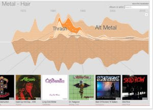 サイトは 音楽タイムライン さまざまな音楽ジャンルの上にマウスを移動するだけで、そのジャンルの最も代表的なアーティストが下に表示されます。 履歴グラフは明らかにアメリカの音楽市場を参照しており、実際、50 年代に最も多く聴かれた音楽はジャズであったことがわかります。 このビューには、過ぎ去った時代のどのアルバムが現在も聴かれているかが表示され、さまざまなジャンルの主要なアーティストを追跡して、彼らのストーリーを読んだり、彼らの音楽を聴いたりすることができます。 たとえば、メタル ジャンルをクリックすると、このタイプの音楽の長年にわたる人気傾向と、各サブジャンルを構成する最も人気のあるアーティストを確認できます。