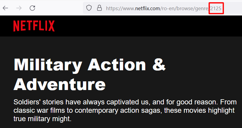 3.書く https://www.netflix.com/ro-en/browse/genre/secretcode Web ブラウザのアドレス バーで、「secretcode」を下のリストの実際のコードに置き換えて、 入れ(入力) . たとえば、コード 2125 はカテゴリに移動します 軍事行動 & 冒険 . ネットフリックス すべての映画とテレビ番組をおすすめするようになりました(映画やテレビ番組) この属でタグ付けされています。